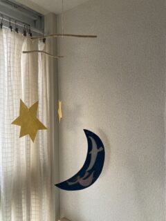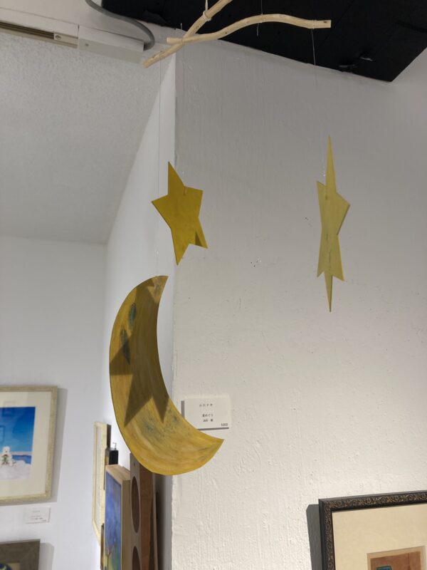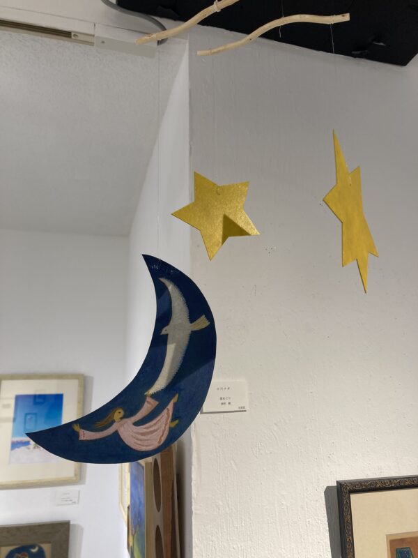 「星めぐり」(モビール)by 小川ナオin 「星をつなぐ」展、ブログ、展示on 投稿日: 2025年12月1日2025年12月3日 「星めぐり」(モビール) 油彩 紙 木 テグス sold 表裏で絵柄が変わります。 支えの木から、月の下までは、約60cmです。 吊り下げ用タコ糸・S字フック付き。