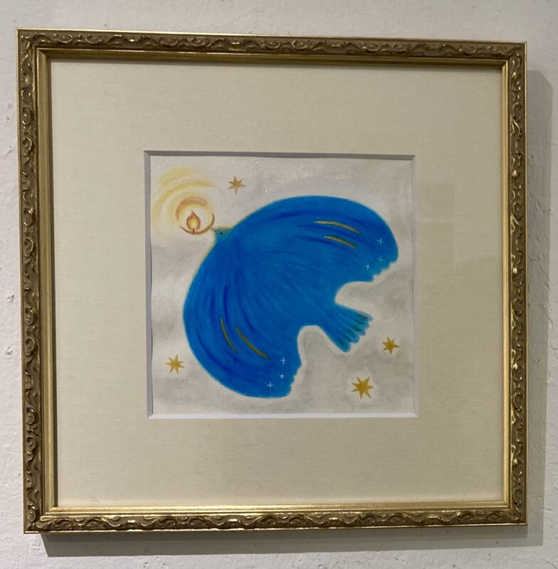 「星に舞う」by 小川ナオin 「星をつなぐ」展、ブログ、展示on 投稿日: 2025年12月1日 「星に舞う」(140×140) アクリル絵の具 水彩紙 25cm正方形額 sold 額装する前にスキャンし忘れてしまい、額装の画像のみですみません。 今までにない鳥の形でおおらかに描きたくて、描いてみました。