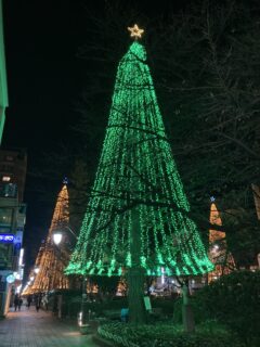 ギャラリーに向かう朝、バスから見上げたライトを配線した大きなイチョウのてっぺんの星に、